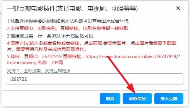 上面 1292722 为豆瓣ID,直接填入到插件输入框里点击获取即可