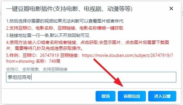 例如要发布电影《泰坦尼克号》直接在输入框输入即可,然后点击获取